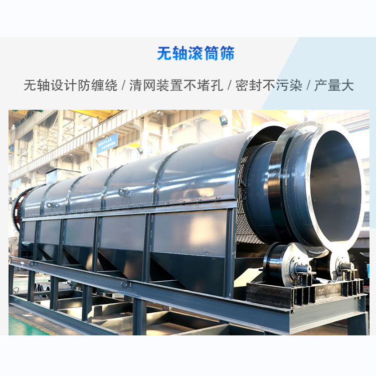 無軸滾筒篩是分選技術(shù)上運(yùn)用廣泛的一種篩分設(shè)備,在石料場中可用于大小石子分級,并對石料外部的泥土和石粉進(jìn)行分離作業(yè),在沙石場中可用于沙石的相互分離篩選,在化工行業(yè)、煤炭工業(yè)中,也可于塊狀物料和粉狀物料的篩選作業(yè),在垃圾處理場可以將城市生活垃圾的破袋、篩分和分選,可以滿足不同的生產(chǎn)需要。